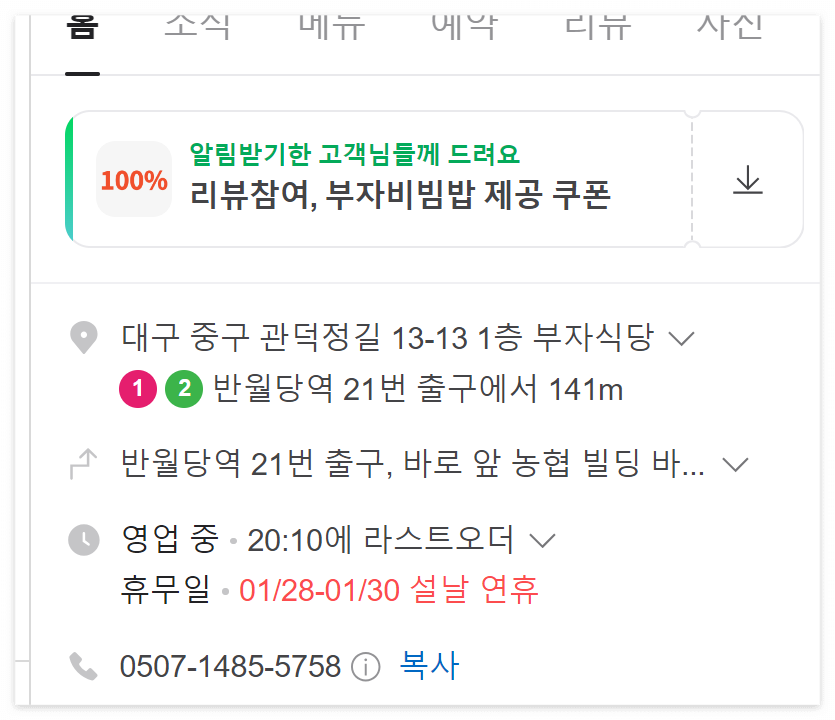 아래 네이버 지도에서 알림 받기 한 고객님들께 부자비빔밥 제공 쿠폰도 준다고 합니다.